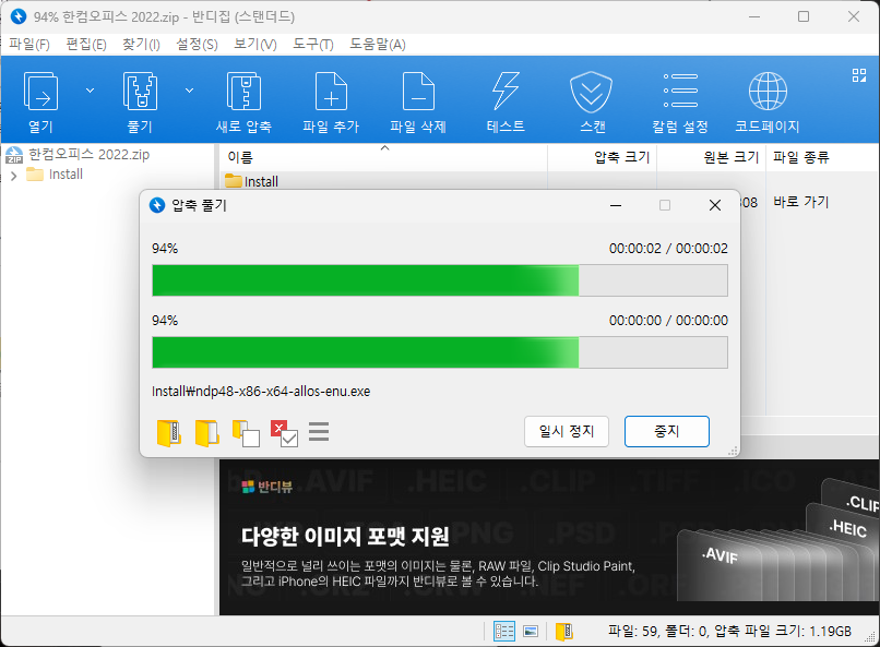 한컴오피스 2022.zip 파일을 압축해제해 줍니다. 만약 윈도우 기본 툴로 압축 해제가 되지 않는다면 반디집이나 알집 같은 프로그램을 설치한 후 압축을 해제해 주시면 됩니다.