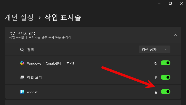 widget 부분의 버튼을 비활성화 해주시면 됩니다. 그렇게 되면 작업 표시줄에서 위젯이 사라지게 됩니다.