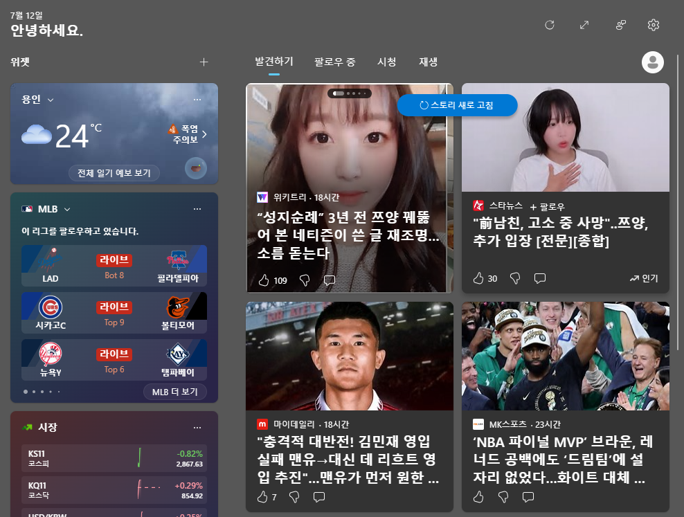 위젯 단축키는 Win+W 단축키로 불러낼 수 있습니다.