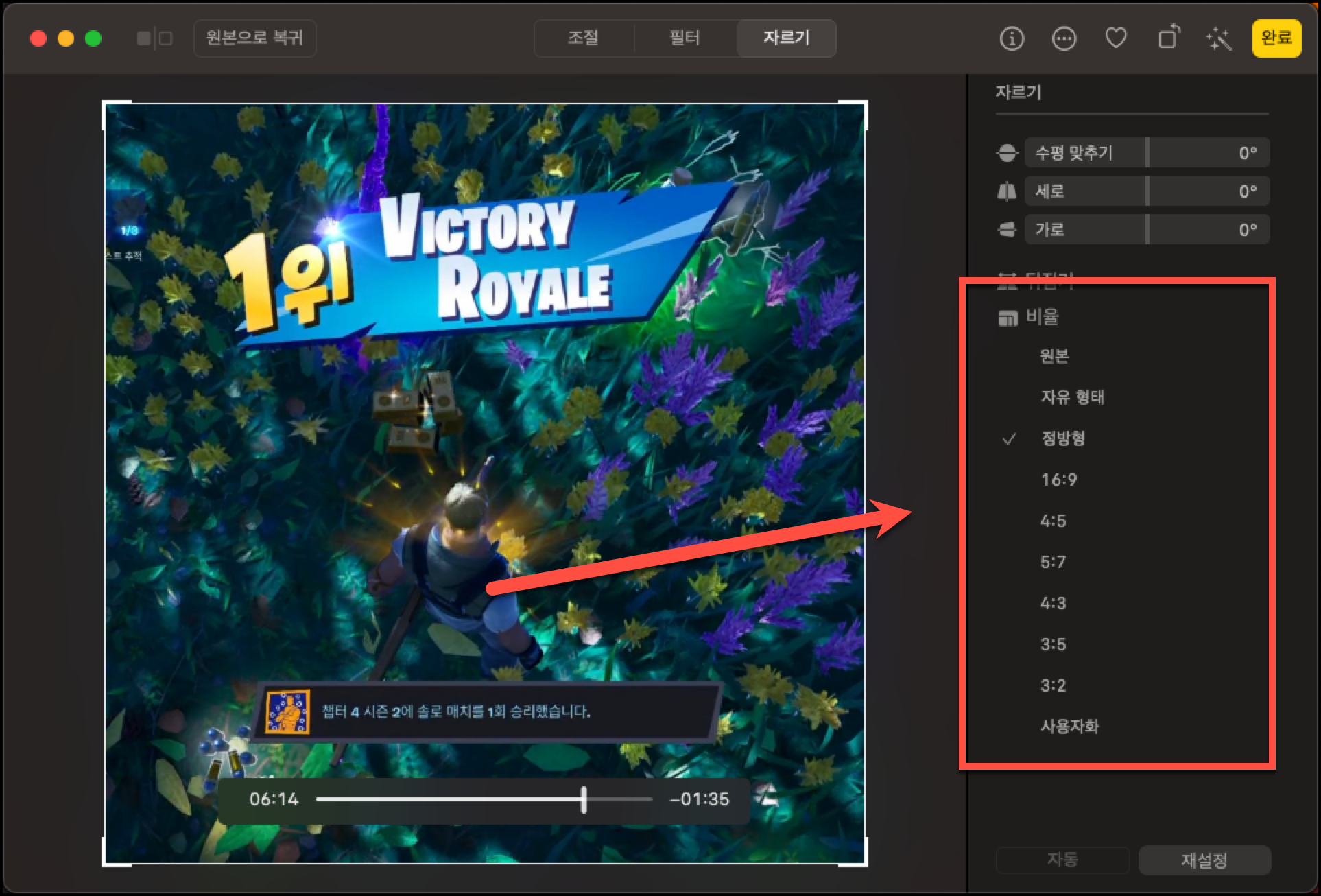 우측에 보시면 비율을 선택하실 수 있습니다. 정방형이나 비율을 선택하실 수도 있고 사용자화를 선택해서 비율을 지정해 주실수도 있습니다.
