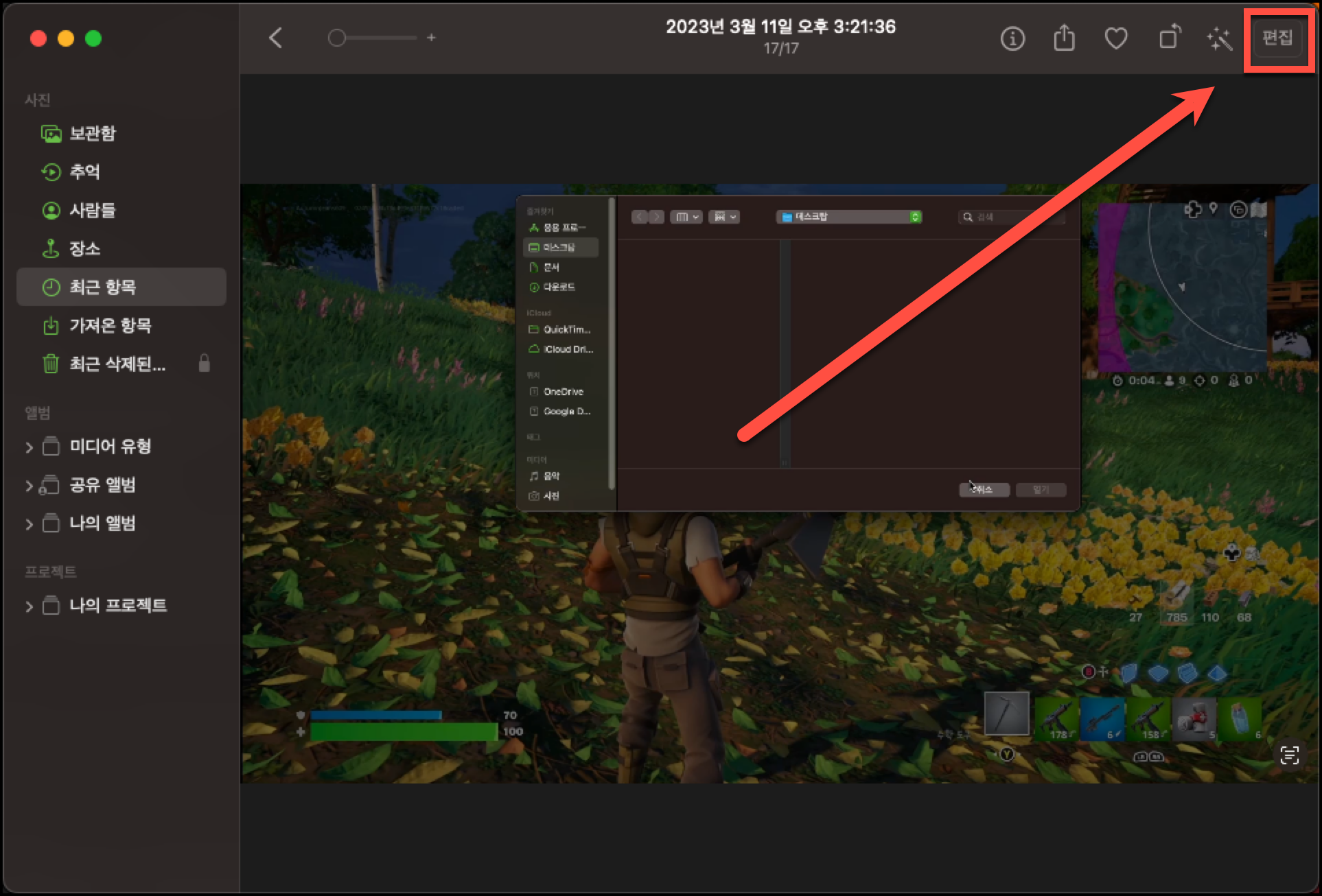 사진 앱에서 동영상을 열어 보시면 우측 상단에 편집 버튼이 있습니다. 클릭합니다.