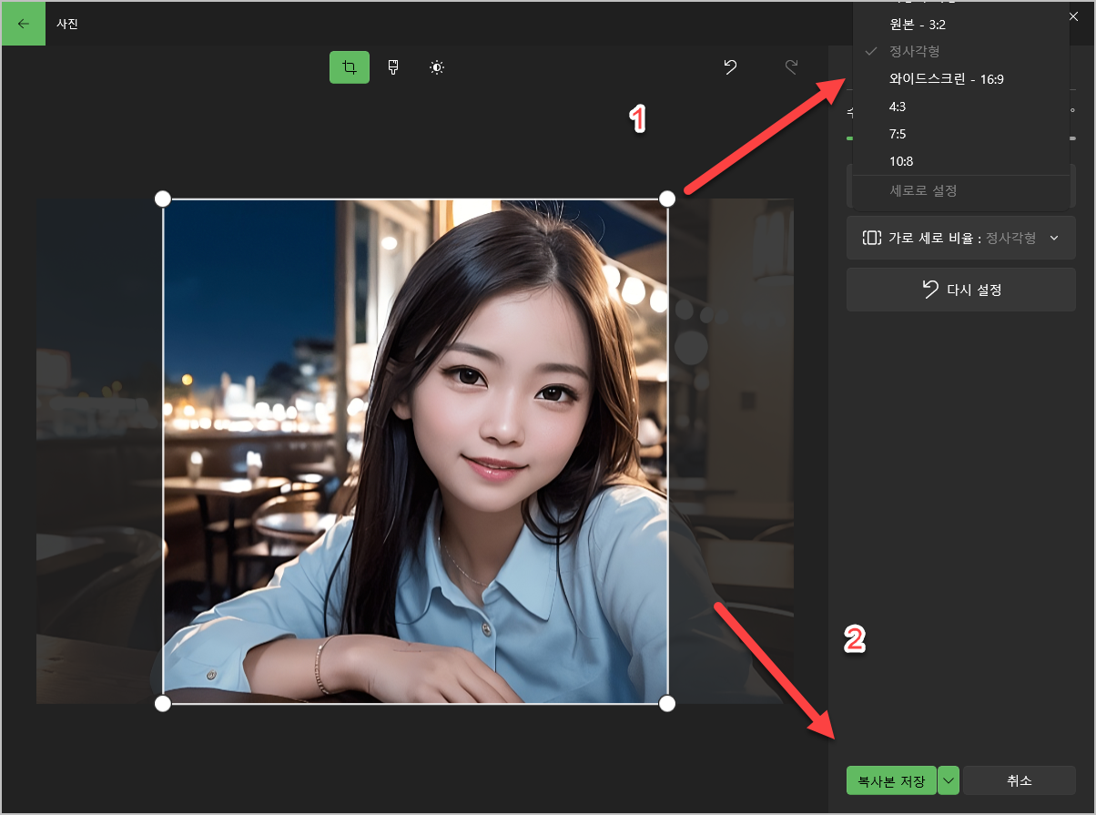 정사각형을 클릭하면 이미지를 1:1 비율인 정사각형으로 자를 수 있게 표시됩니다.