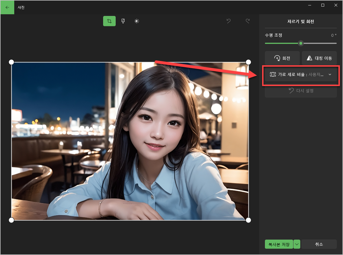 자르기 및 회전에서 아래 [가로 세로 비율] 부분을 클릭해줍니다.