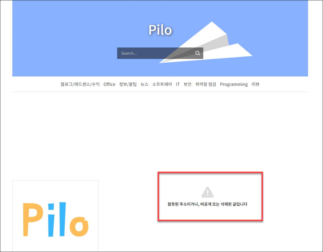 해당 페이지를 가보시면 티스토리의 경우 [잘못된 주소이거나, 비공개 또는 삭제된 글입니다.] 메시지가 나타나게 됩니다.