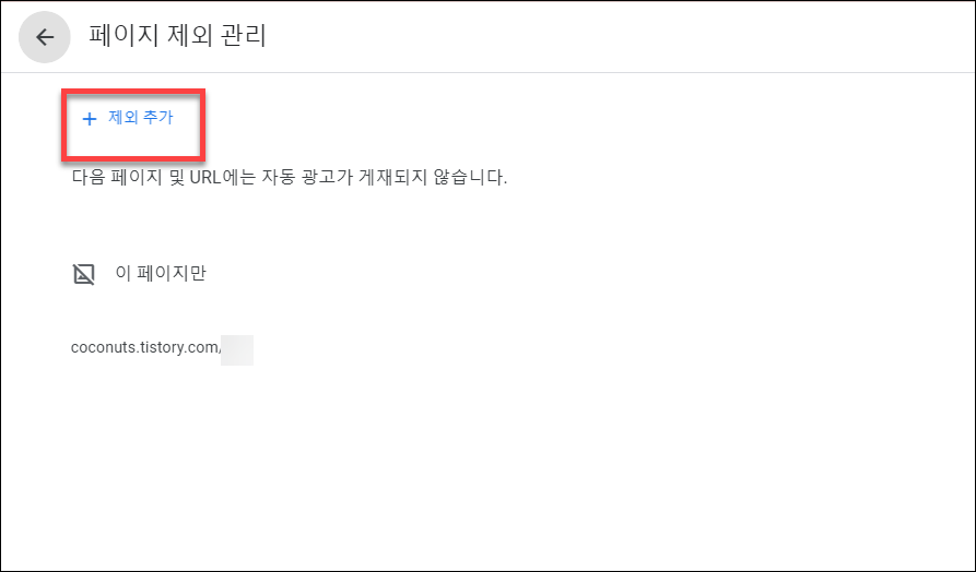 페이지 제외 관리에서 아까 광고를 게재할 수 없는 페이지를 여기 입력해 주시면 더 이상 광고 게재를 시도하지 않게 되고, 정책 오류를 해결할 수 있습니다.