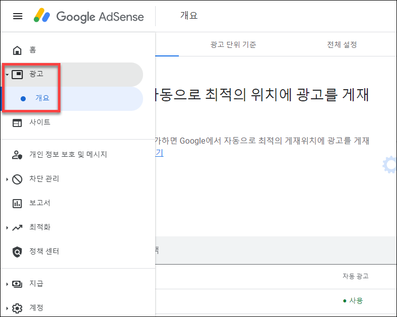 애드센스에서 광고 > 개요로 들어가 줍니다.