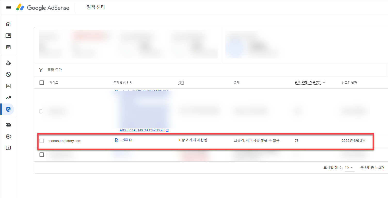 애드센스 정책 센터로 들어가셔서 영향을 받고 있는 사이트를 확인해 줍니다.