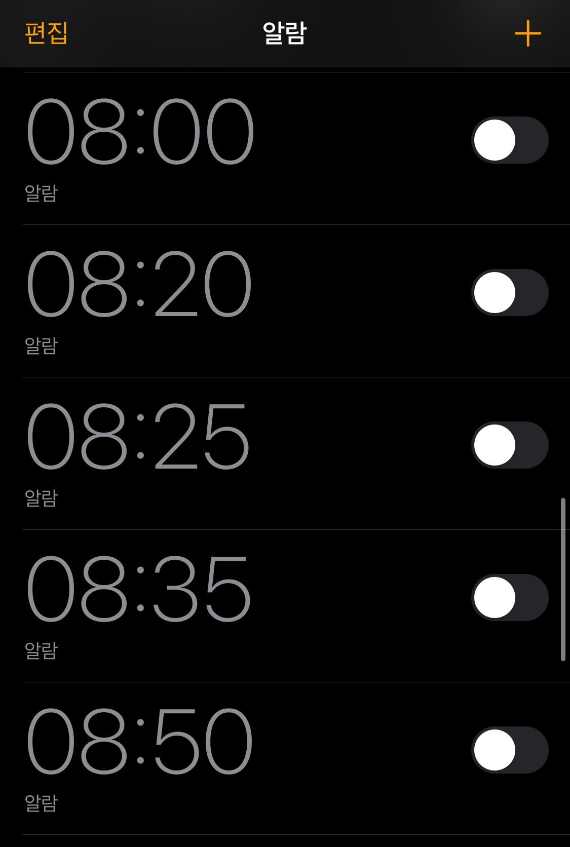 아이폰 알람을 수도 없이 많이 설정해 두었습니다. 이렇게 5분 10분 단위로 설정하는 알람은 건강상 좋지 못하다고 하는데 저는 그 짧은 시간 더 자는 것의 행복에 취해서 바꾸지 못하고 있습니다.