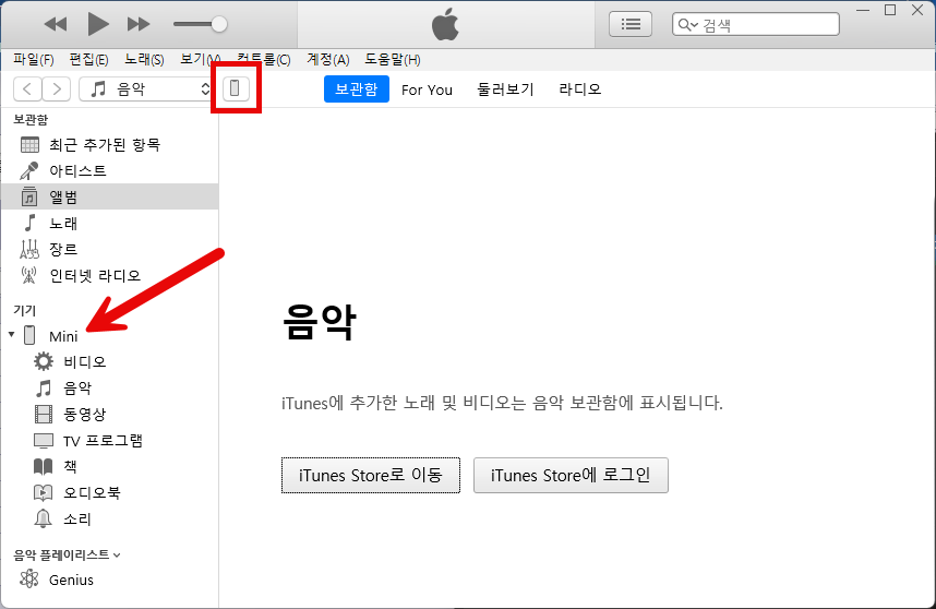 먼저 아이폰을 연결하게 되면 기기가 뜨게 됩니다. 여기서 기기 모양을 클릭해 줍니다.