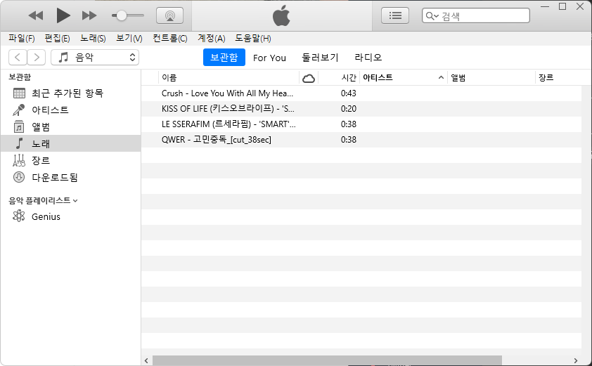 먼저 아이튠즈 설치하신 후 노래 탭에 원하시는 음악 mp3 파일을 드래그해서 넣어 줍니다.