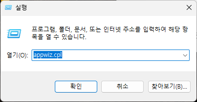 여기서 [appwiz.cpl]을 입력해 줍니다.