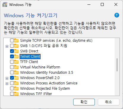 Windows 기능에서 [Telnet Client]를 찾아서 체크해 준 뒤 확인을 클릭해서 기능을 활성화 해줍니다.