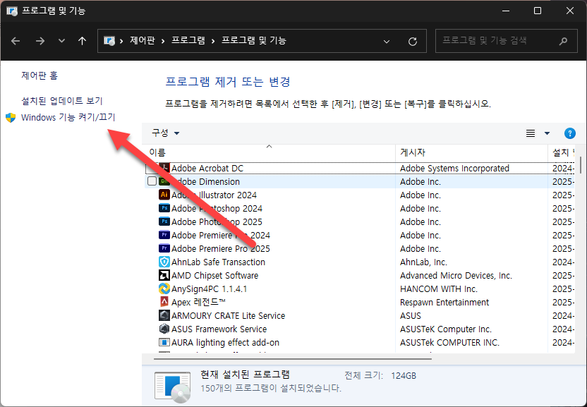 왼쪽 메뉴에서 [Windows 기능 켜기/끄기]를 클릭해 줍니다.