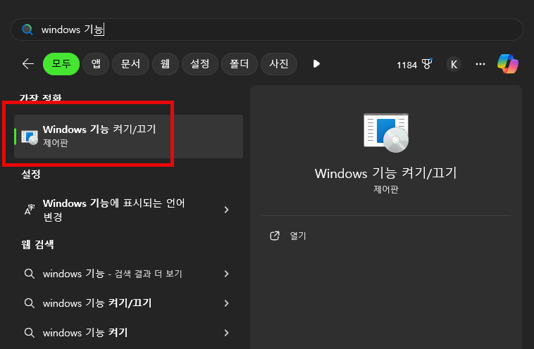 먼저 Windows 기능 켜기/끄기를 검색해서 열어 줍니다.