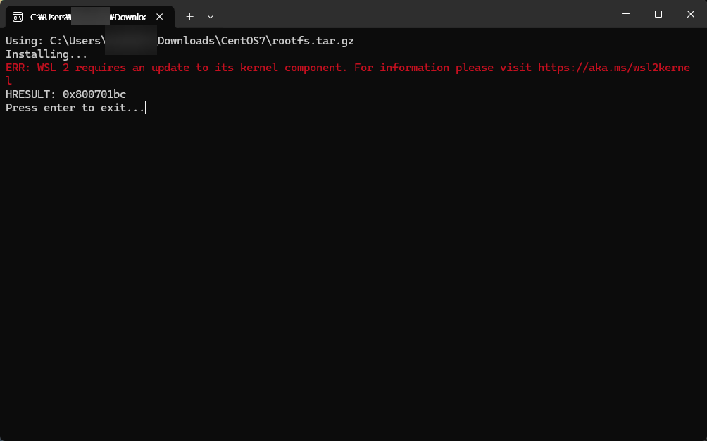 ERR: WSL 2 requires an update to its kernel component. For information please visit https://aka.ms/wsl2kernel