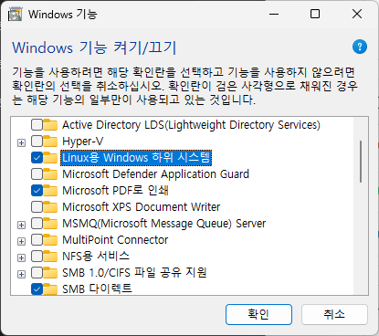 해당 기능을 활성화해서 WSL를 사용할 수 있습니다.