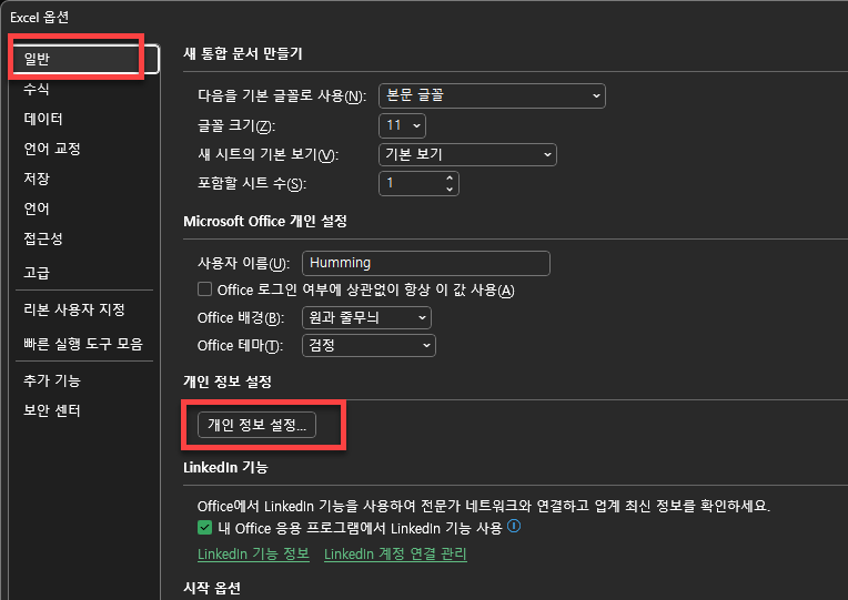 일반 항목에 개인 정보 설정 메뉴가 있습니다. [개인 정보 설정] 클릭해 줍니다.