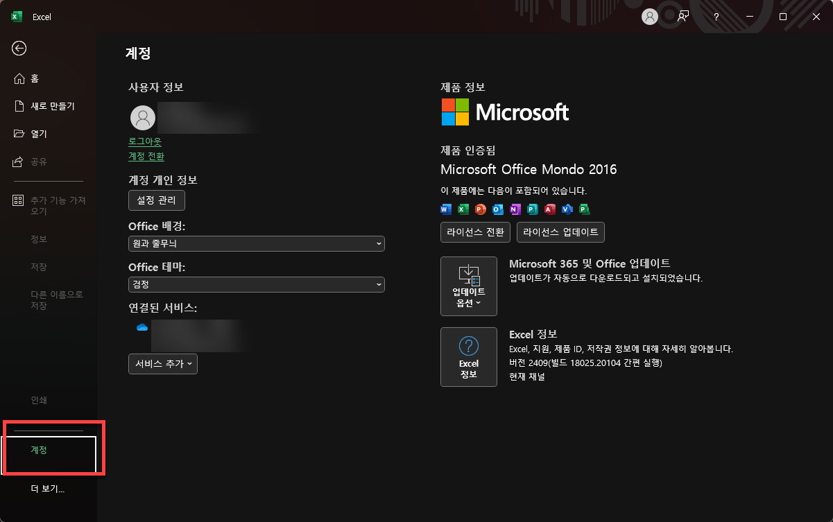 먼저 오피스 프로그램을 열어 주신 후 왼쪽 상단에 파일을 클릭해서 설정으로 들어가 주신 후 왼쪽 하단에 있는 계정을 클릭해 줍니다.