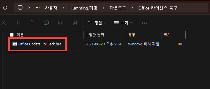 그리고 office update rollback 배치 파일을 마우스 우클릭 후 관리자 권한으로 실행 시켜 주시면 됩니다.