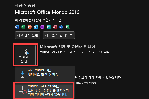 업데이트 옵션 항목이 있는데, 클릭해 주신 후 [업데이트 사용 안 함]을 클릭해 줍니다.
