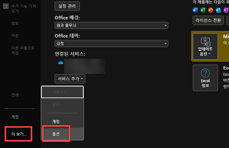 아까 설정 창으로 돌아가 주신 후 왼쪽 하단 더보기 > 옵션을 클릭해 줍니다.