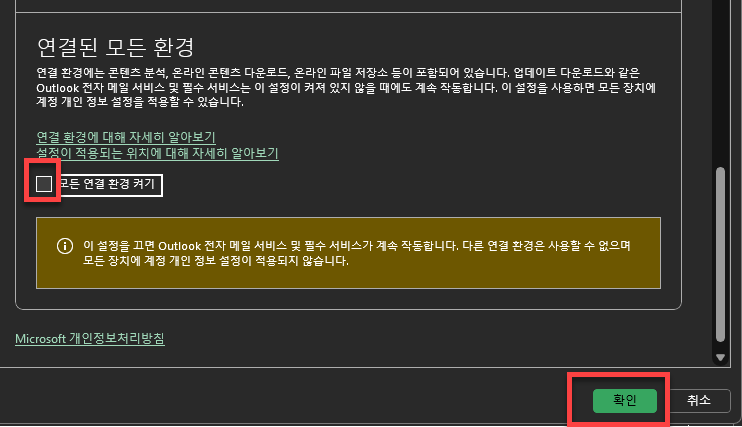 연결된 모든 항목 부분에서 [모든 연결 환경 켜기]를 체크 해제 한 후 확인을 클릭해 줍니다.