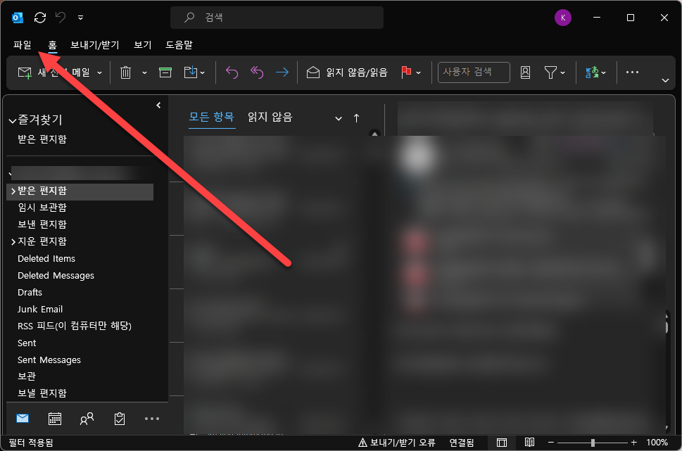 먼저 아웃룩을 켜서 왼쪽 상단에 있는 [파일] 메뉴로 들어가 줍니다.