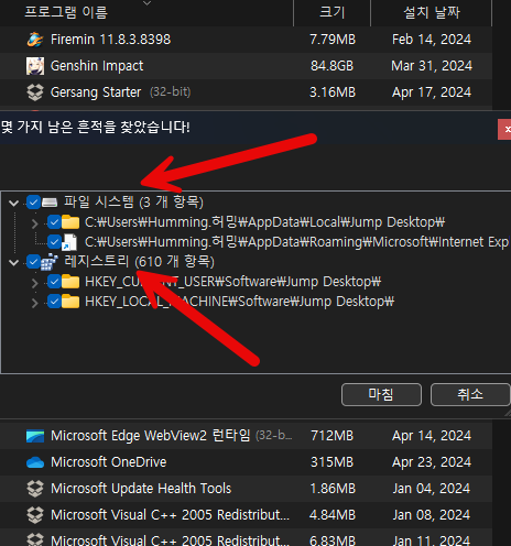 파일 시스템과 레지스트리 단에서도 삭제할 프로그램들을 모두 나열해 주게 됩니다.