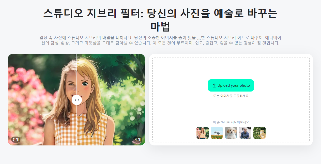 AI 기반의 스튜디오 지브리 스타일 변환을 제공하며, 간편하게 고품질 이미지를 생성할 수 있습니다.