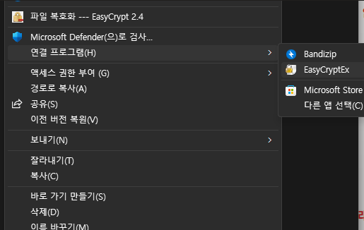 모두 설치가 끝난 후에 EZC 파일을 마우스 우클릭 하신 후 연결 프로그램에 들어가시면 EasyCryptEx 라는 프로그램이 생긴 것을 확인 하실 수 있습니다.