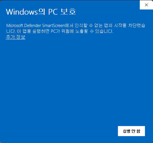 실행하실 때에는 외부에서 받은 파일이기 때문에 Windows의 PC 보호 창이 뜰 수 있습니다.