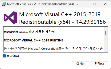 설치하는 과정에서 Microsoft Visual C++ 관련 파일도 함께 설치가 진행되야 합니다.