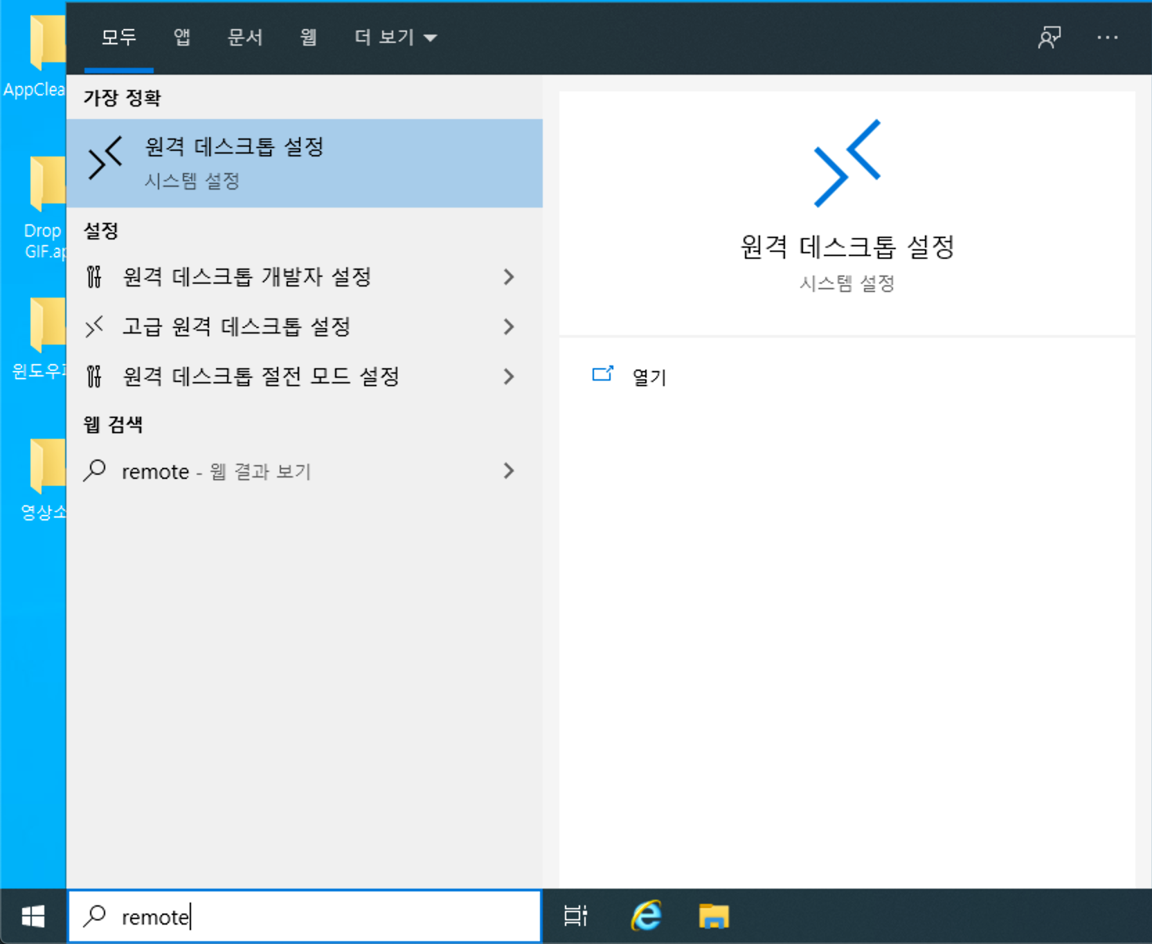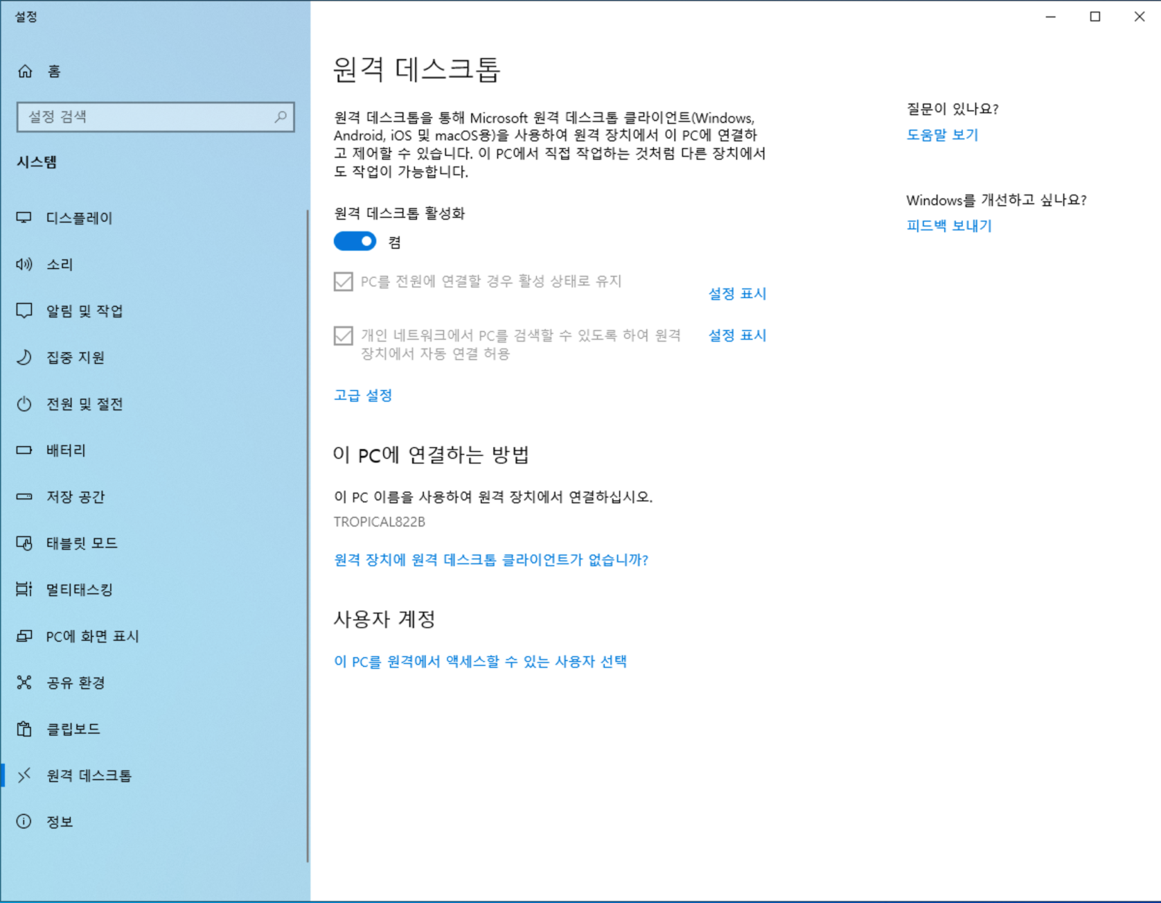 아니면 시작에 remote 라고 검색하시고 원격 데스크톱 설정으로 들어오시면 돼요 😗