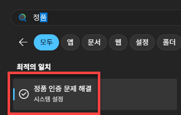 윈도우 정품 인증이 정상적으로 완료 되었는데 확인하는 방법은 윈도우 검색에 [정품 인증 문제 해결]을 검색해서 들어가 줍니다.