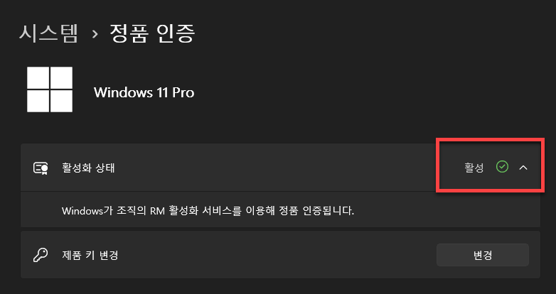 정품 인증에서 활성화 상태에 활성이라고 나타나 있으면 인증이 완료된 겁니다.
