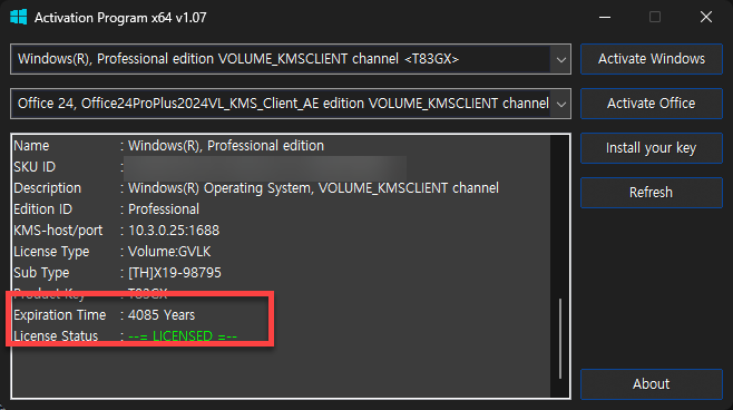 인증이 완료 되면 Expiration Time 인증 만료일이 표시되고 현재 라이선스 상태가 나타나게 됩니다.