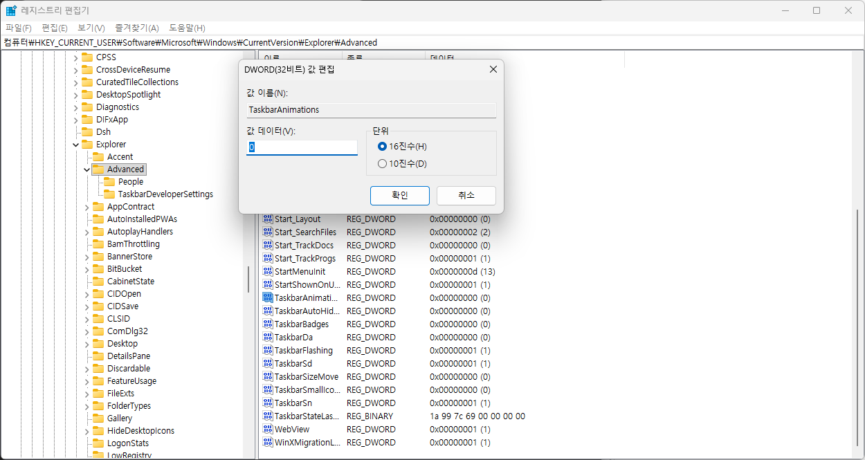 [이미지 3: TaskbarAnimations 값 설정 화면]
