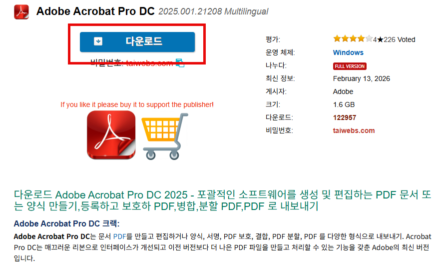다운로드 사이트를 이용해 Adobe Acrobat Pro DC 2025 버전을 받아 줍니다.