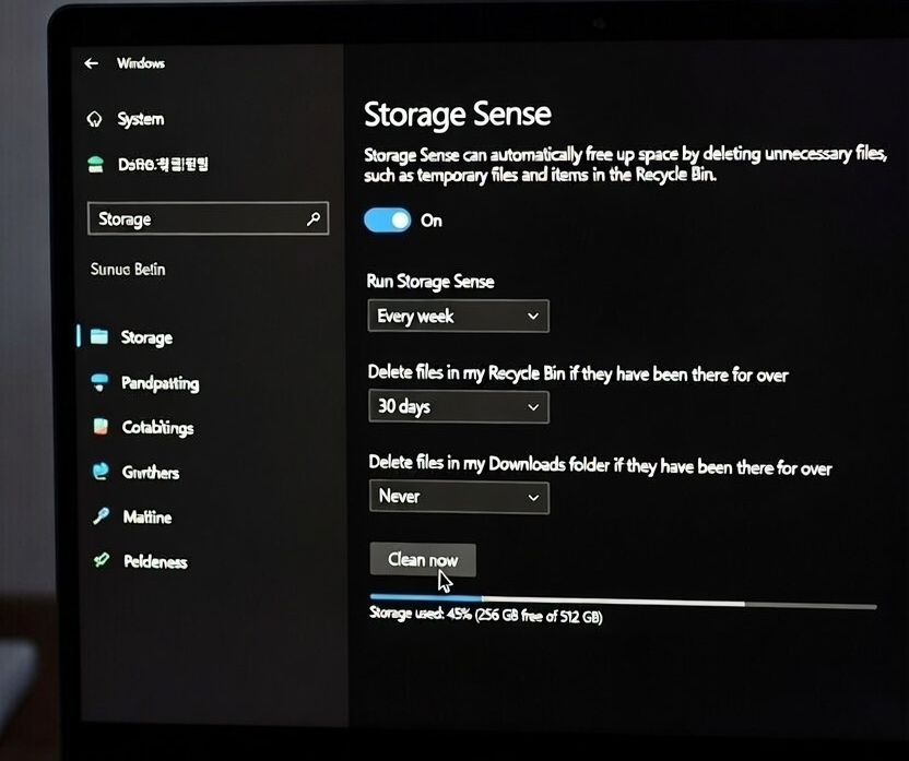 SSD 용량이 90% 이상 가득 차면 쓰기 속도가 저하된다는 사실, 알고 계셨나요? 윈도우의 '저장 공간 센스' 기능을 활용하면 불필요한 임시 파일과 휴지통을 자동으로 비워 성능을 유지할 수 있습니다.