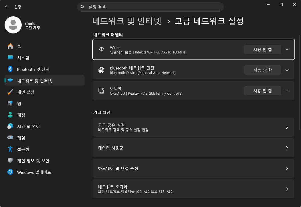 - Windows: 장치 관리자 → 네트워크 어댑터 업데이트