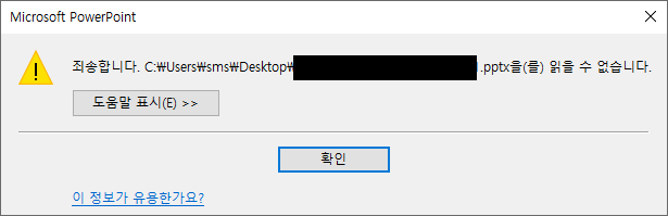 아래와 같은 문구가 뜨면서 안열리거나 파일이 깨져서 열리는 경우가 있습니다
