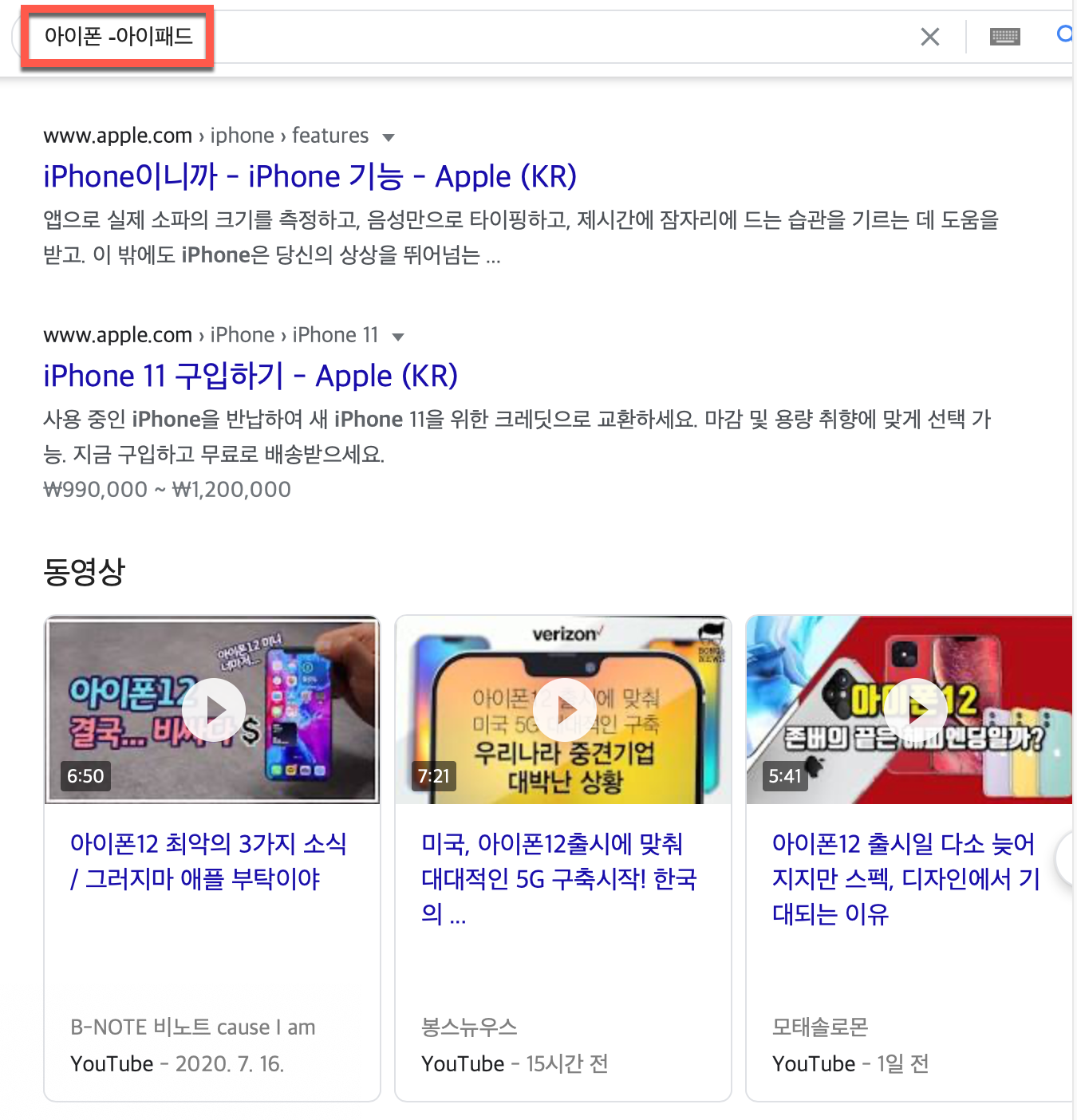 ex) 애플 -아이패드 / 아이패드를 제외한 애플 키워드로 검색해서 보여줌