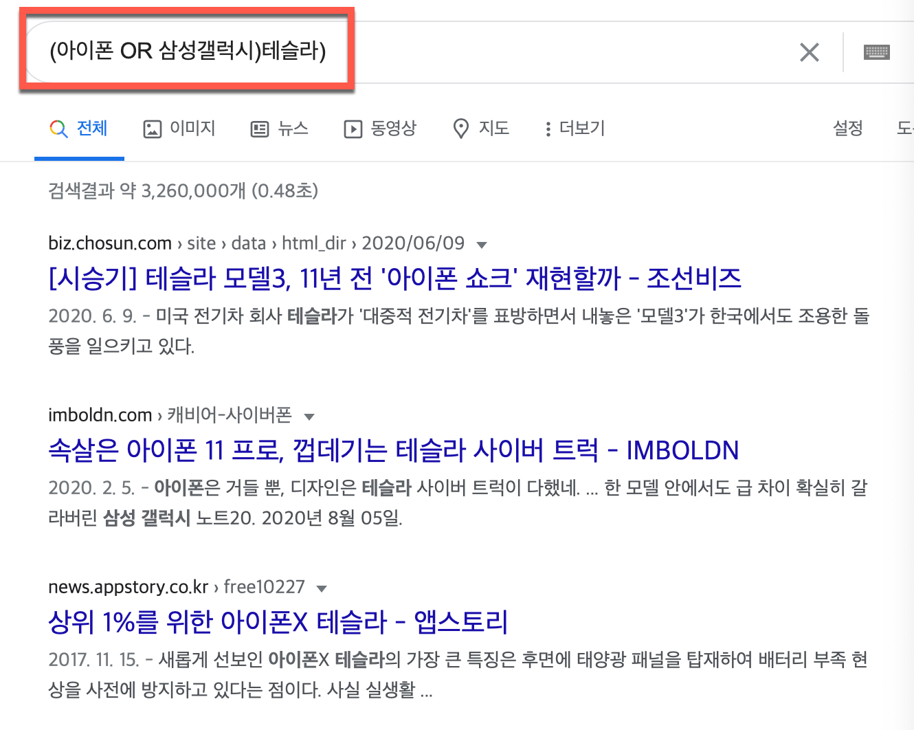 ex) (아이폰 OR 갤럭시)워치) / 아이폰 또는 갤럭시를 검색하지만 뒤에 워치가 붙어야 함