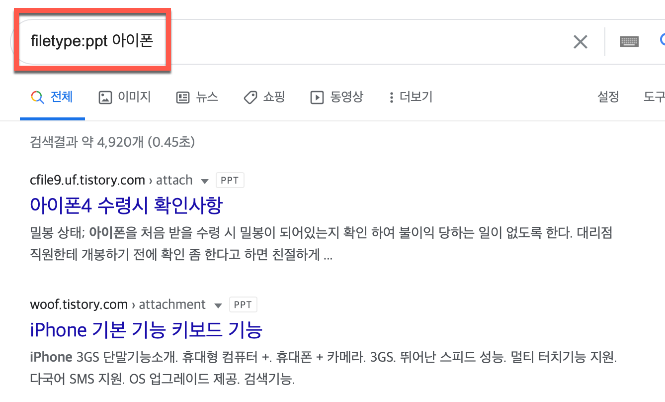 ex) filetype:ppt 논문 / 논문 검색어 중에 .ppt 확장자를 가진 검색어