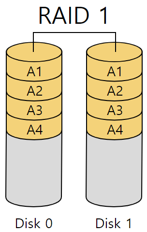 각 멤버 디스크에 같은 데이터를 중복 기록한다. 멤버 디스크 중 하나만 살아남으면 데이터는 보존되며 복원도 1:1 복사로 매우 간단하기 때문에, 서버에서 끊김 없이 지속적으로 서비스를 제공하기 위해 사용한다.