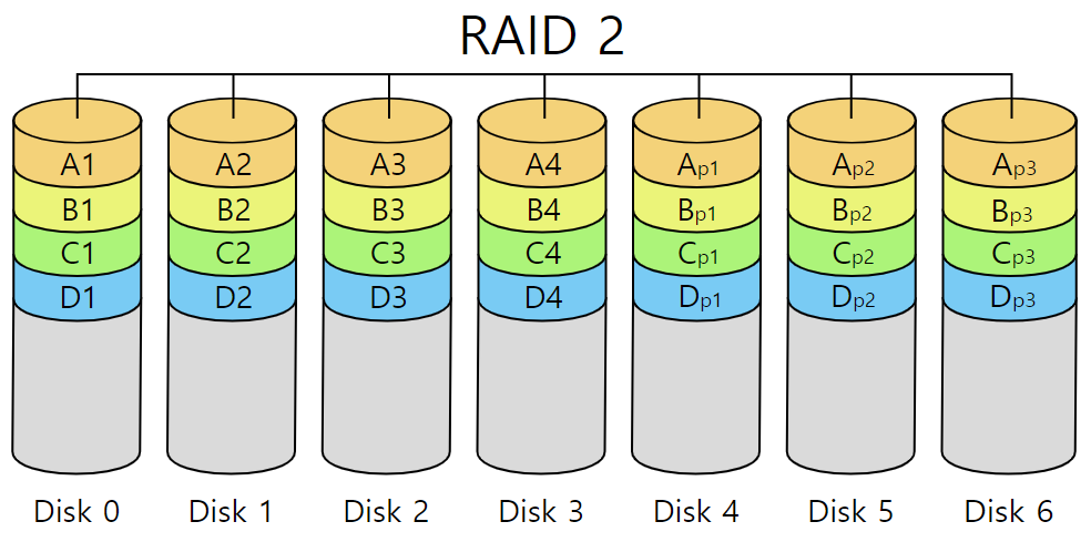 오류정정부호(ECC)를 기록하는 전용의 하드디스크를 이용해서 안정성을 확보한다. RAID 2는 비트 단위에 Hamming code를 적용하며, RAID 3, 4는 각각 바이트, 워드 단위로 패리티를 저장한다. 하나의 멤버 디스크가 고장나도 ECC를 이용하여 정상적으로 작동할 수 있지만, 추가적인 연산이 필요하여 입출력 속도가 매우 떨어진다.