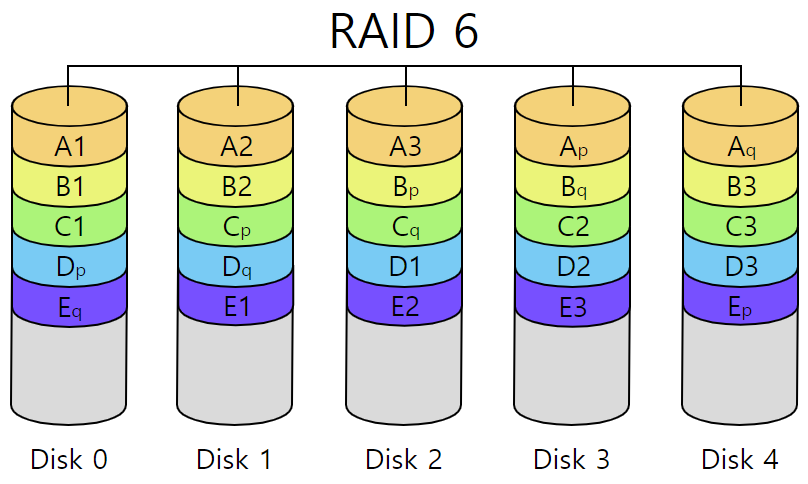 RAID 5와 원리는 같으며, 서로 다른 방식의 패리티 2개를 동시에 사용한다. 성능과 용량을 희생해서 가용성을 높인 셈. N개의 디스크를 사용하면 (N-2)배의 저장 공간을 사용할 수 있다.