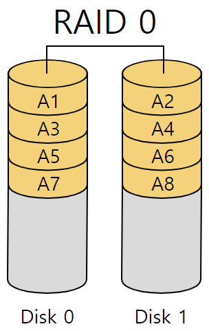 여러 개의 멤버 하드디스크를 병렬로 배치하여 거대한 하나의 디스크처럼 사용한다. 데이터 입출력이 각 멤버 디스크에 공평하게 분배되며, 디스크의 수가 N개라면 입출력 속도 및 저장 공간은 이론상 N배가 된다. 다만 멤버 디스크 중 하나만 손상 또는 분실되어도 전체 데이터가 파손되며, 오류검출 기능이 없어 멤버 디스크를 늘릴수록 안정성이 떨어지는 문제가 있다. 따라서 장착된 하드디스크의 개수가 RAID-5 구성 조건에 충족되지 않는 등의 불가피한 경우가 아니라면 절대로 RAID 0으로 구성하지 않는 걸 추천한다.