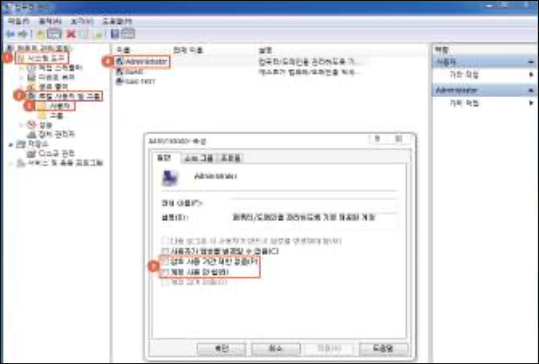 (시작 -> 실행 -> "lusrmgr.msc" 입력 -> 사용자 -> Administrator 우클릭 -> 속성)