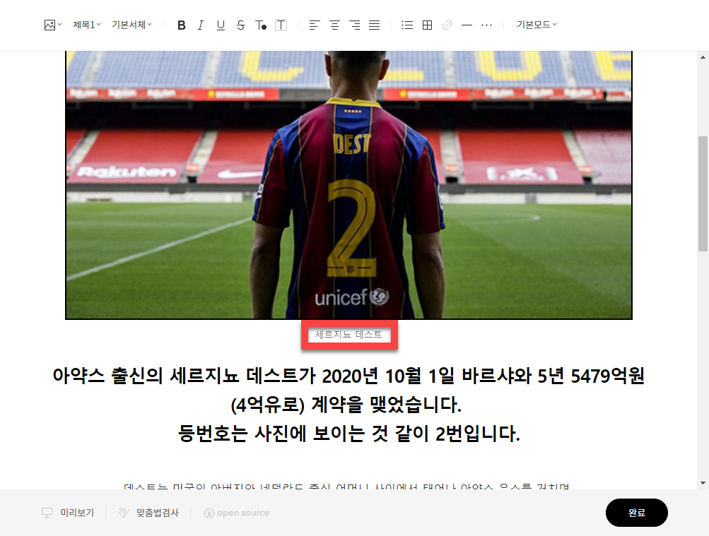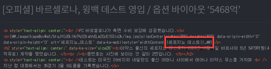 오른쪽 상단에 글쓰기 모드를 HTML 로 바꾸어 보시면